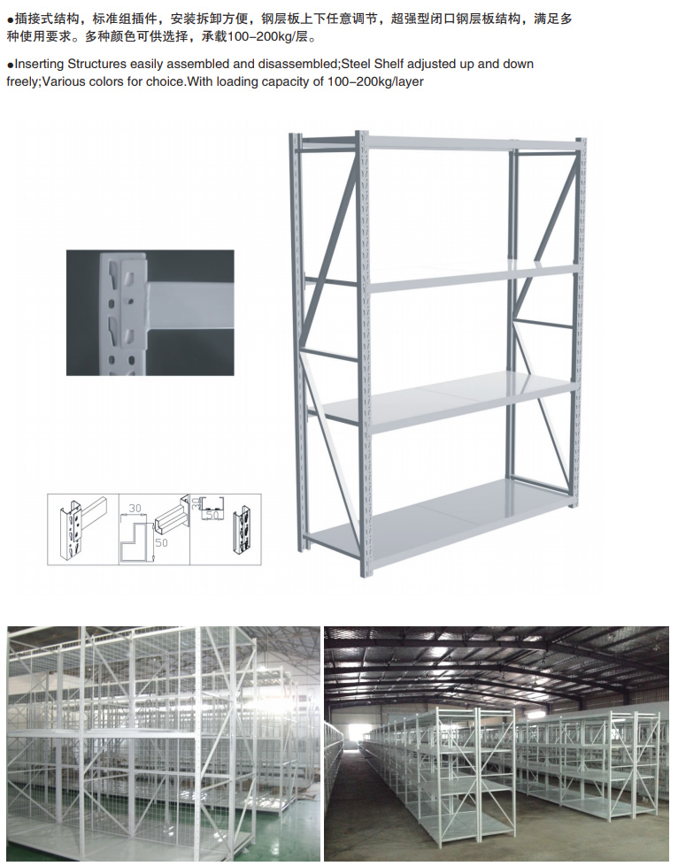 輕型貨架是非常經(jīng)濟實用方便的一款倉庫貨架,因其載重量較輕,故常稱為輕型貨架。貨架是由三種構(gòu)件:立柱片、橫梁、層板組成。輕型貨架整體采用無螺釘組合式設計,安裝拆卸方便快捷。適合存放一些輕質(zhì)小件貨品,是層板貨架的一種。輕型貨架的結(jié)構(gòu)與中型相同,可自同拆裝,層高以5cm間距可自由調(diào)節(jié),只是其材料規(guī)格相對較小,承載量也相對較小,此種輕型貨架價格相對經(jīng)濟,結(jié)構(gòu)相對萬能角鋼貨架要穩(wěn)定牢靠,在1500cm跨度內(nèi),可承載100-200kg.表面采用噴塑處理,美觀整潔!∵m用于存放輕中型物品,人工存取的場合。