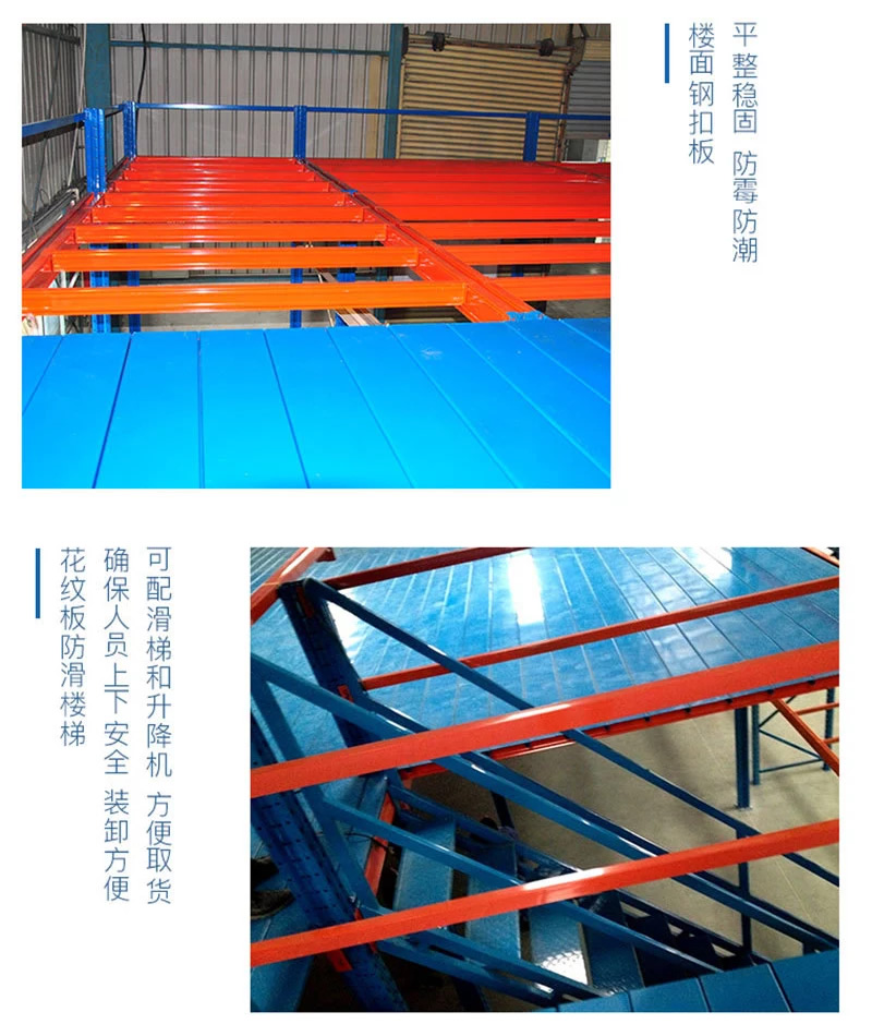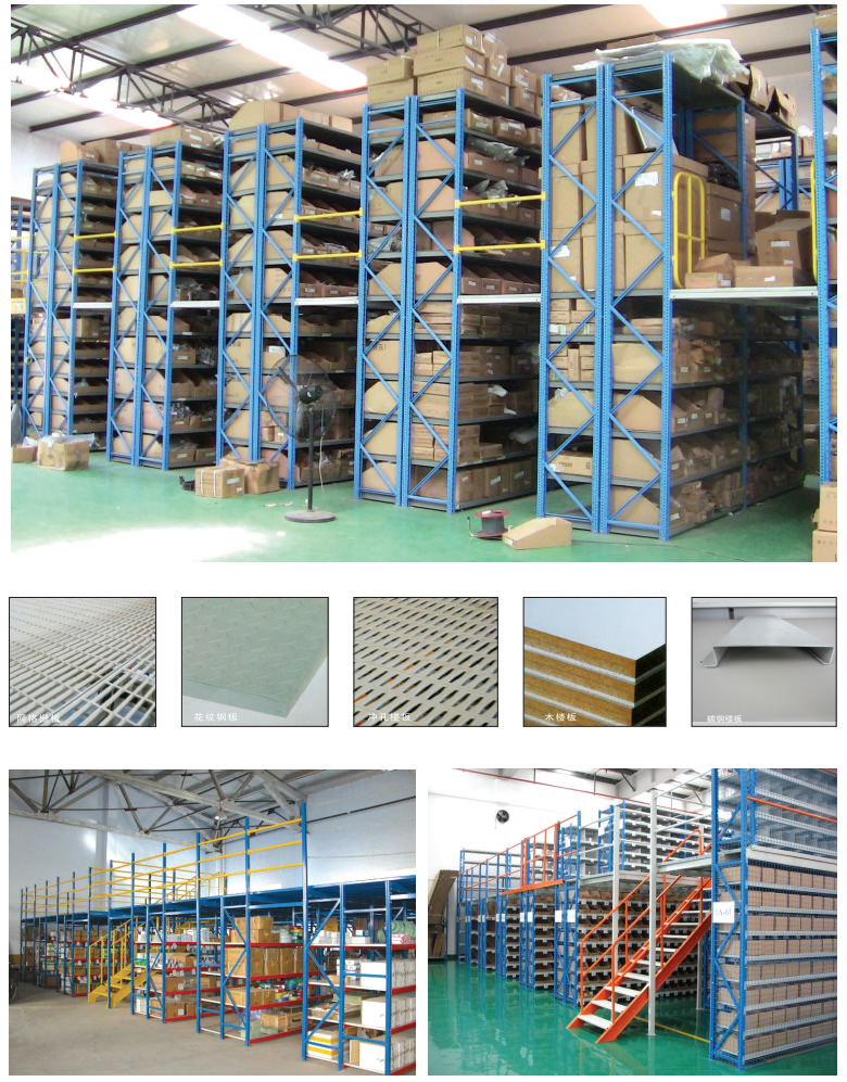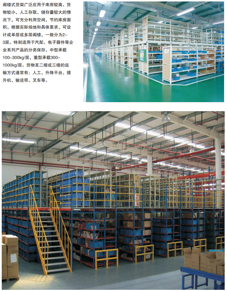 些輕泡及中小件貨物,適于多品種大批量或多品種小批量貨物,人工存取貨物,貨物通常由叉車、液壓升降臺(tái)或貨梯送至二樓、三樓,再由輕型小車或液壓托盤車送至某一位置。此類系統(tǒng),通常利用中型擱板式貨架或重型擱板式貨架作為主體和樓面板的支撐(根據(jù)單元貨架的總載重量來決定選用何種貨架),樓面板通常選用冷軋型鋼樓板、花紋鋼樓板或鋼格柵樓板。